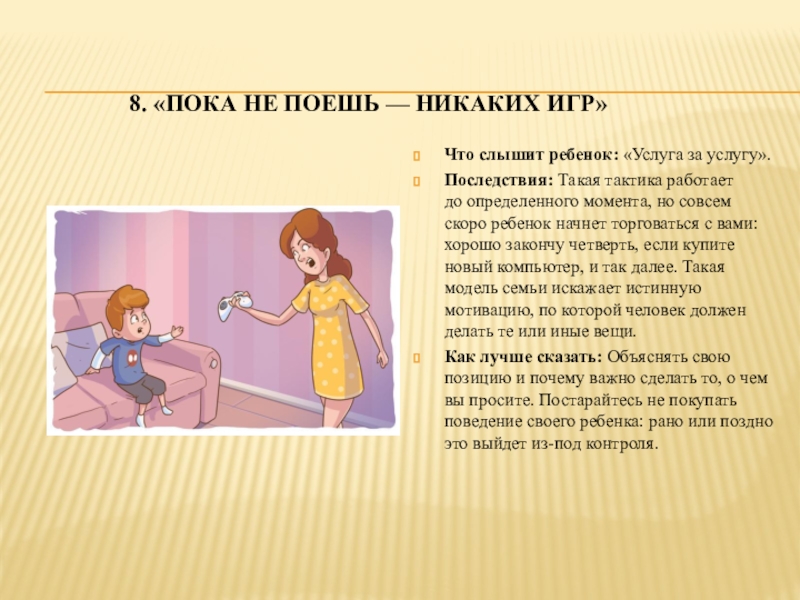 Как лучше сказать: Объяснять свою позицию и почему важно сделать то, о чем вы просите. Постарайтесь не покупать поведение своего ребенка: рано или поздно это выйдет из-под контроля.