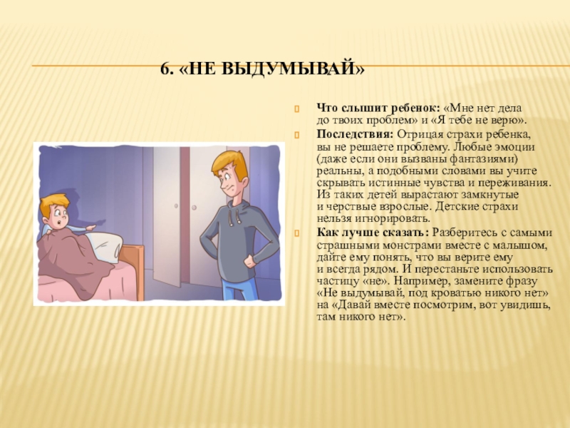 Отрицая страхи ребенка, вы не решаете проблему. Любые эмоции (даже если они вызваны фантазиями) реальны, а подобными словами вы учите скрывать истинные чувства и переживания. Из таких детей вырастают замкнутые и черствые взрослые. Детские страхи нельзя игнорировать.