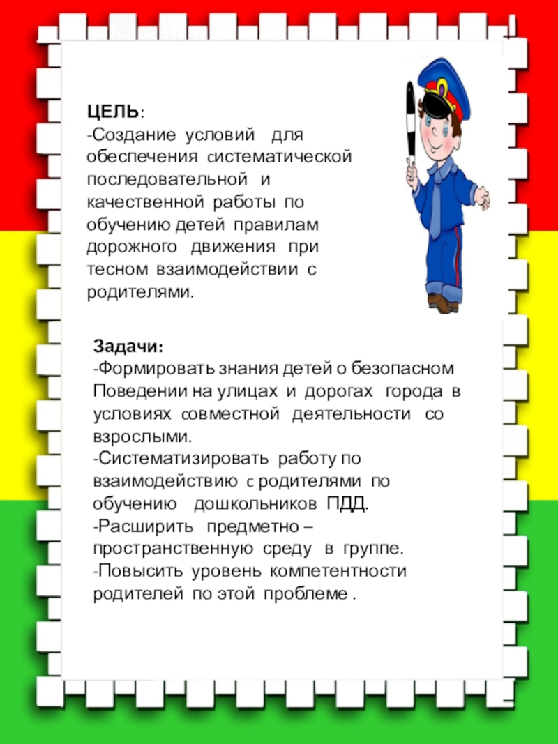 -Систематизировать работу по взаимодействию c родителями по обучению дошкольников ПДД.