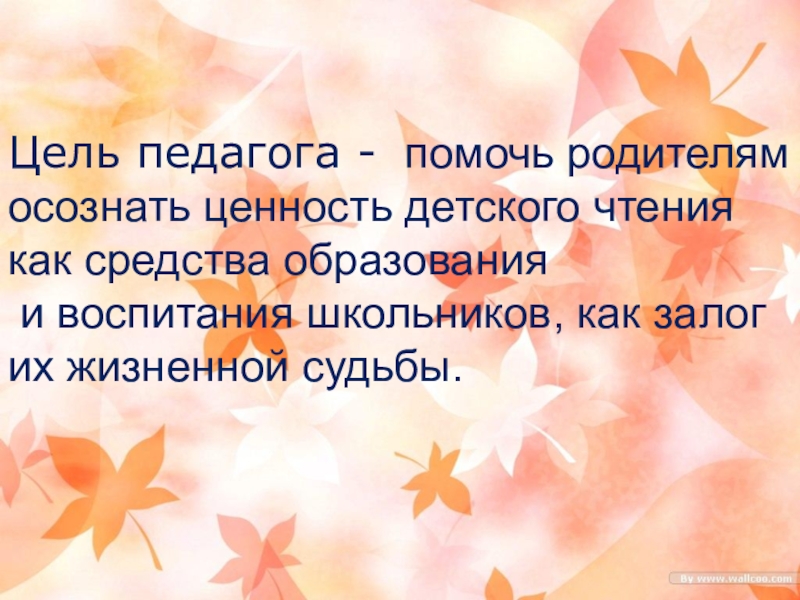 Слайд 9Цель педагога - помочь родителям осознать ценность детского чтения как средства
