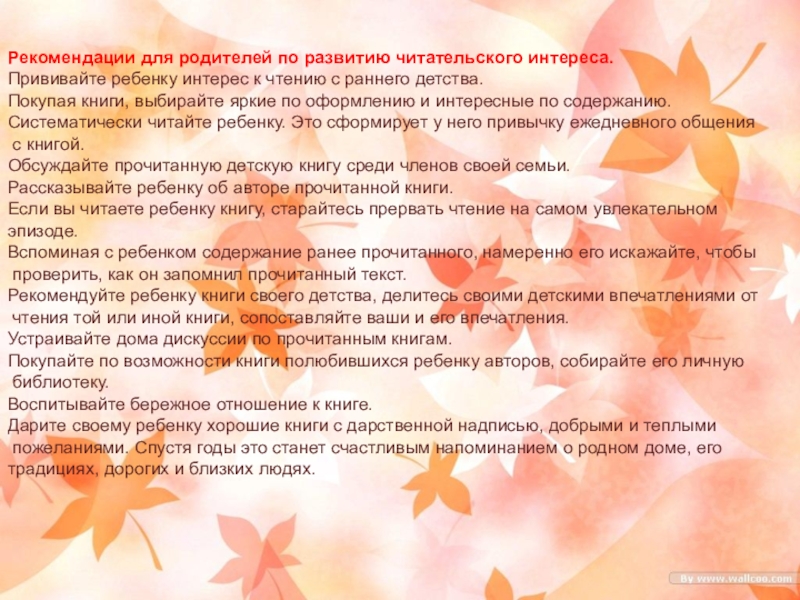 Слайд 14Рекомендации для родителей по развитию читательского интереса.