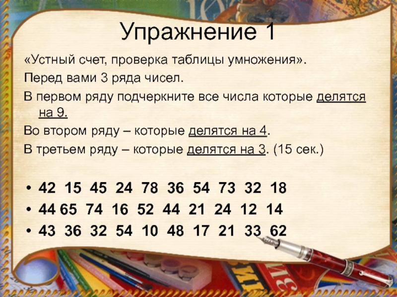 Упражнение 1 «Устный счет, проверка таблицы умножения».Перед вами 3 ряда чисел.В первом ряду подчеркните все числа которые