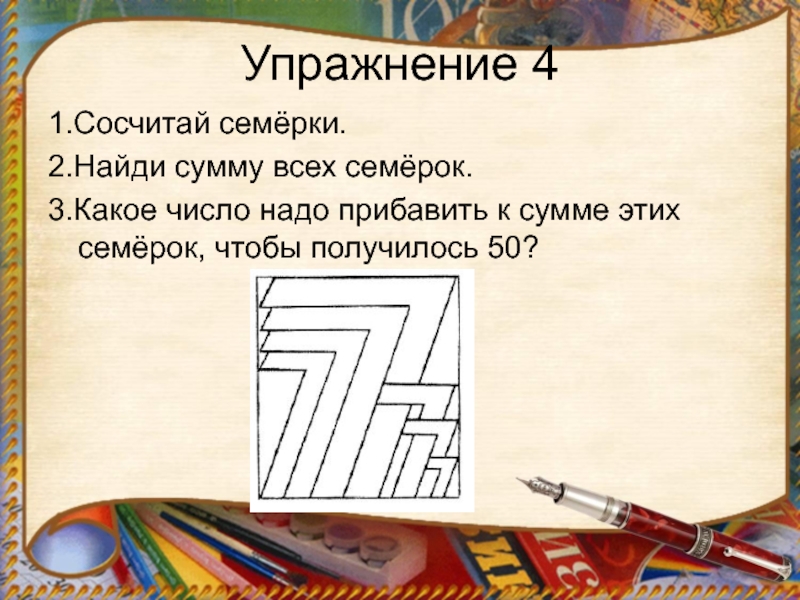 Упражнение 41.Сосчитай семёрки.2.Найди сумму всех семёрок.3.Какое число надо прибавить к сумме этих семёрок, чтобы получилось 50?