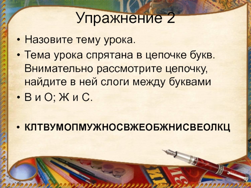 Упражнение 2Назовите тему урока.Тема урока спрятана в цепочке букв. Внимательно рассмотрите цепочку, найдите в ней слоги между