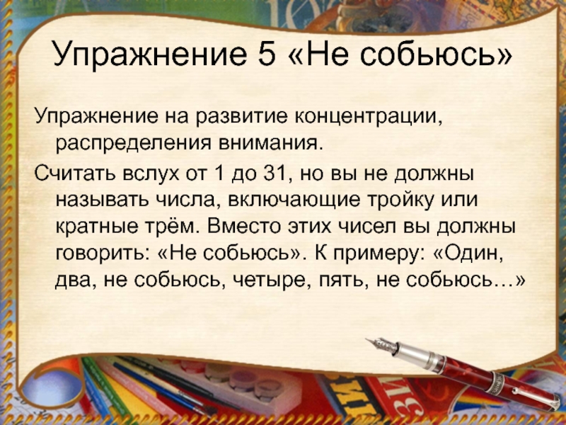 Упражнение 5 «Не собьюсь»Упражнение на развитие концентрации, распределения внимания.Считать вслух от 1 до 31, но вы не