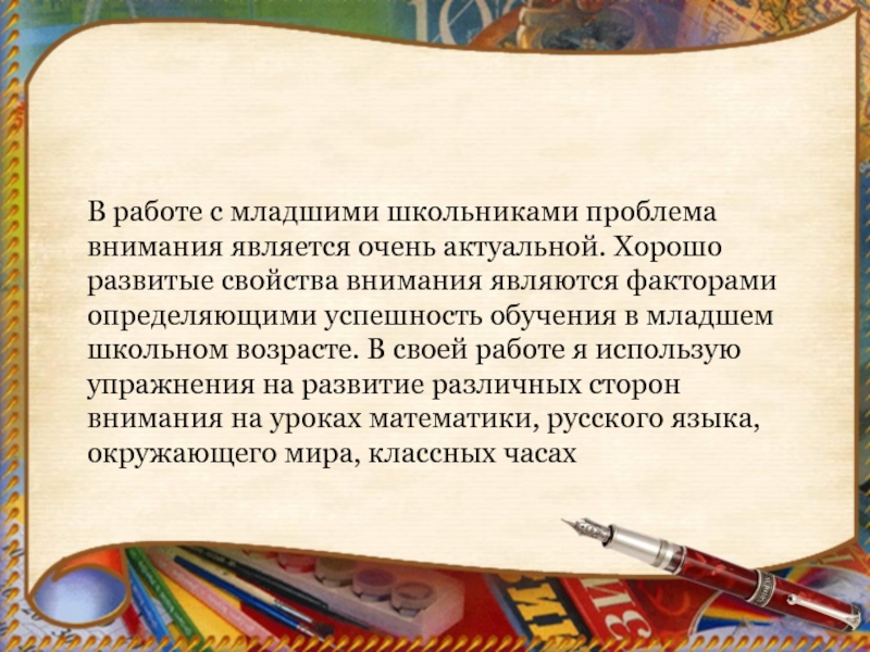 В работе с младшими школьниками проблема внимания является очень актуальной. Хорошо развитые свойства внимания являются факторами определяющими