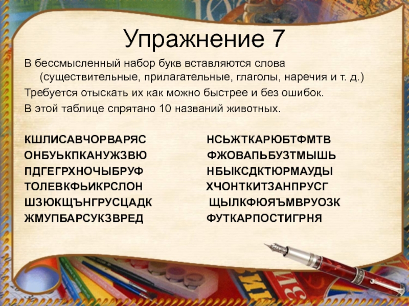 Упражнение 7В бессмысленный набор букв вставляются слова (существительные, прилагательные, глаголы, наречия и т. д.)Требуется отыскать их как