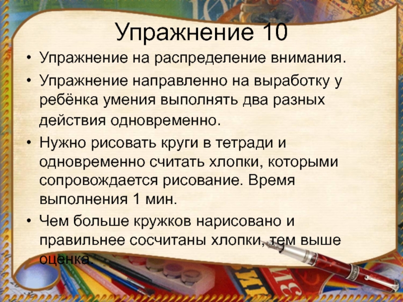 Упражнение 10Упражнение на распределение внимания.Упражнение направленно на выработку у ребёнка умения выполнять два разных действия одновременно.Нужно рисовать