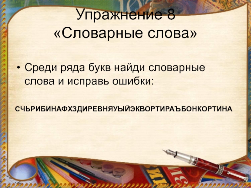 Упражнение 8  «Словарные слова»Среди ряда букв найди словарные слова и исправь ошибки:СЧЬРИБИНАФХЗДИРЕВНЯУЫЙЭКВОРТИРАЪБОНКОРТИНА
