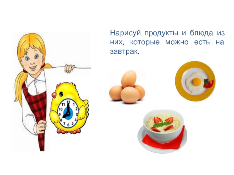 Слайд 6Нарисуй продукты и блюда из них, которые можно есть на завтрак.