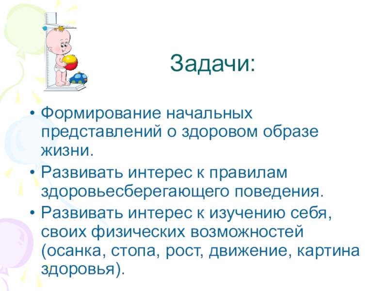Задачи:Формирование начальных представлений о здоровом образе жизни.Развивать интерес к правилам здоровьесберегающего поведения.Развивать интерес к изучению себя, своих