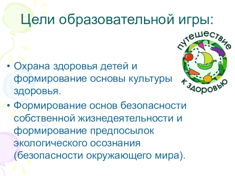 Цели образовательной игры:Охрана здоровья детей и формирование основы культуры здоровья.Формирование основ безопасности собственной жизнедеятельности и формирование предпосылок экологического осознания (безопасности окружающего мира).