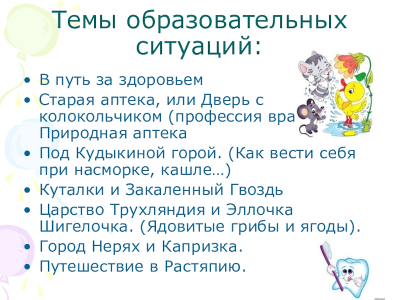 Темы образовательных ситуаций:В путь за здоровьемСтарая аптека, или Дверь с колокольчиком (профессия врача).Природная аптекаПод Кудыкиной горой. (Как