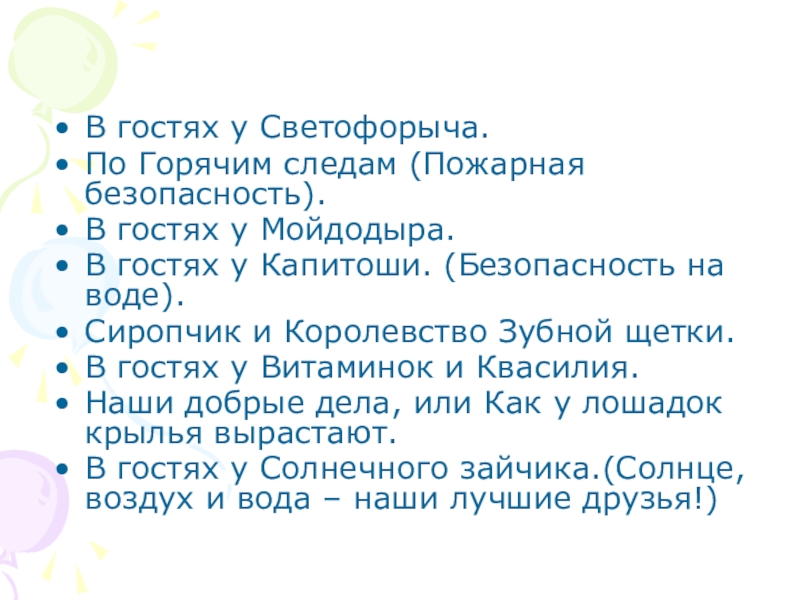 В гостях у Светофорыча.По Горячим следам (Пожарная безопасность).В гостях у Мойдодыра.В гостях у Капитоши. (Безопасность на воде).Сиропчик