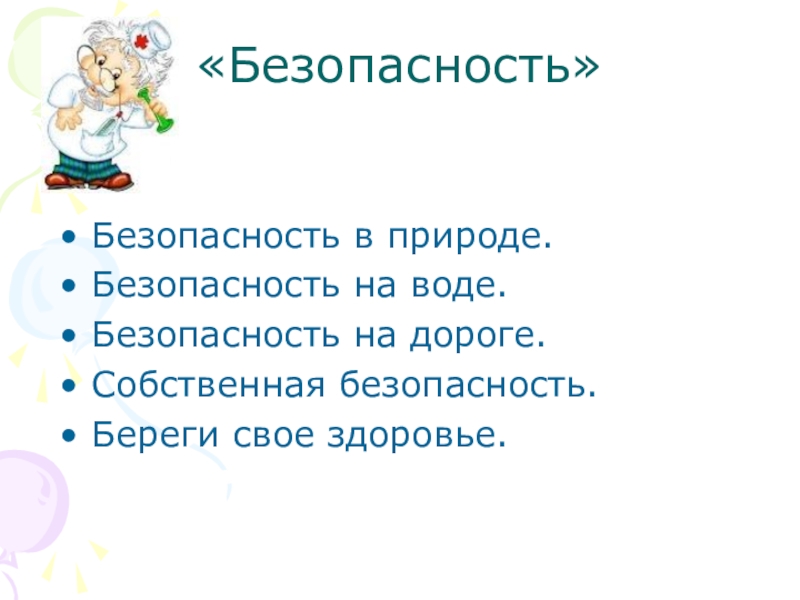 «Безопасность»Безопасность в природе.Безопасность на воде.Безопасность на дороге.Собственная безопасность.Береги свое здоровье.