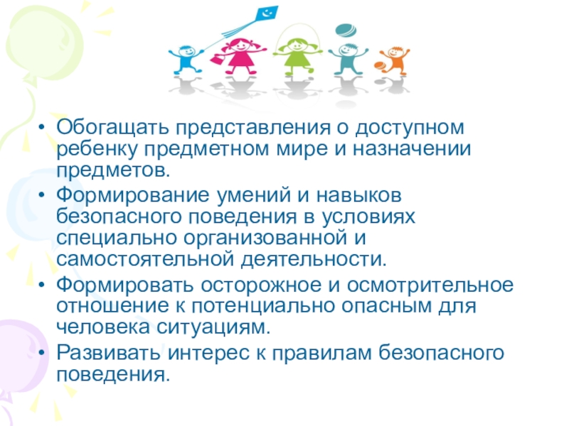 Обогащать представления о доступном ребенку предметном мире и назначении предметов.Формирование умений и навыков безопасного поведения в условиях