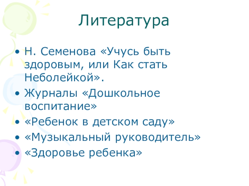 ЛитератураН. Семенова «Учусь быть здоровым, или Как стать Неболейкой».Журналы «Дошкольное воспитание»«Ребенок в детском саду»«Музыкальный руководитель»«Здоровье ребенка»