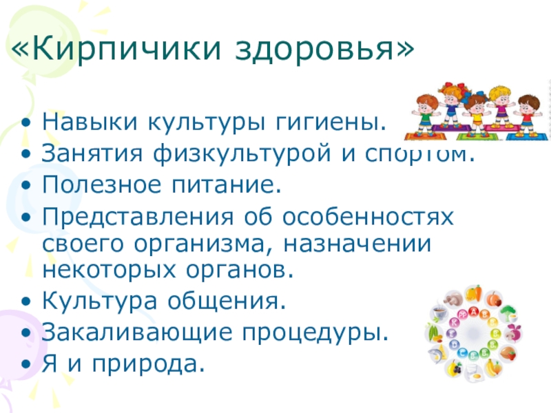 «Кирпичики здоровья»Навыки культуры гигиены.Занятия физкультурой и спортом.Полезное питание.Представления об особенностях своего организма, назначении некоторых органов.Культура общения.Закаливающие процедуры.Я