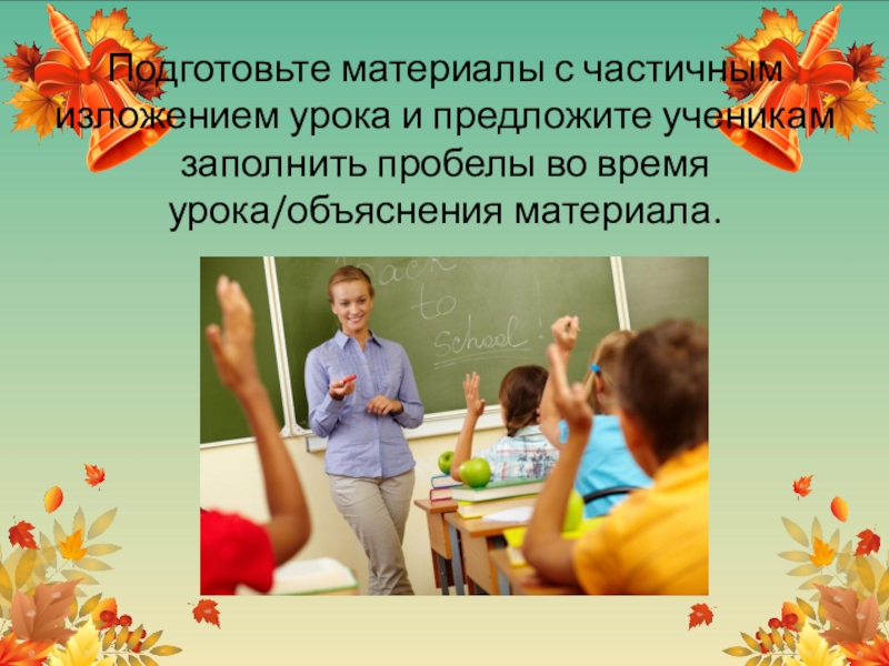 Слайд 7Подготовьте материалы с частичным изложением урока и предложите ученикам заполнить пробелы