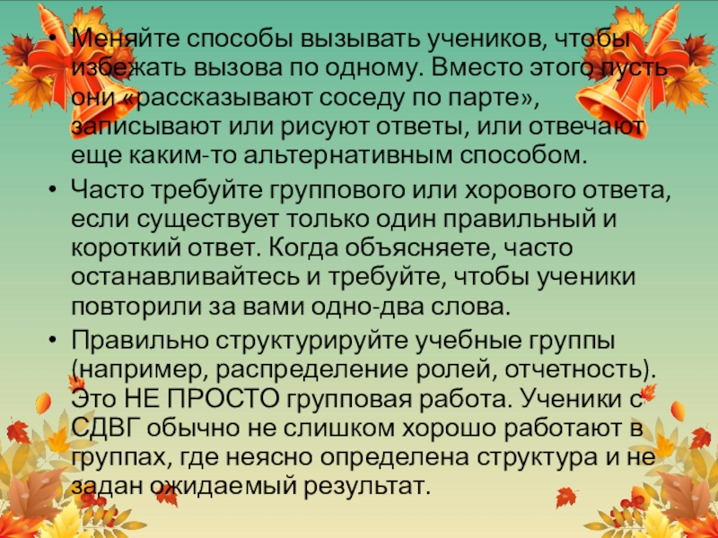 Правильно структурируйте учебные группы (например, распределение ролей, отчетность). Это НЕ ПРОСТО групповая работа. Ученики с СДВГ обычно не слишком хорошо работают в группах, где неясно определена структура и не задан ожидаемый результат.