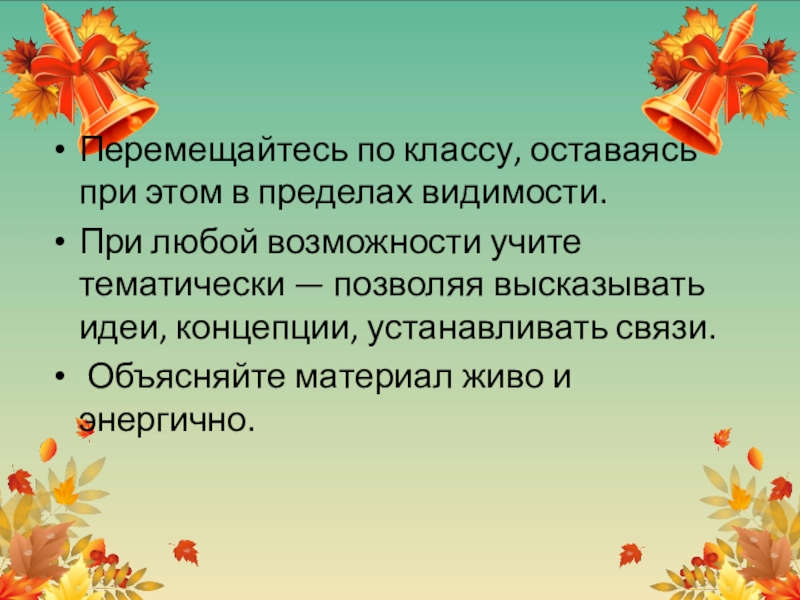 Перемещайтесь по классу, оставаясь при этом в пределах видимости. При любой возможности учите тематически — позволяя высказывать идеи, концепции, устанавливать связи. Объясняйте материал живо и энергично.