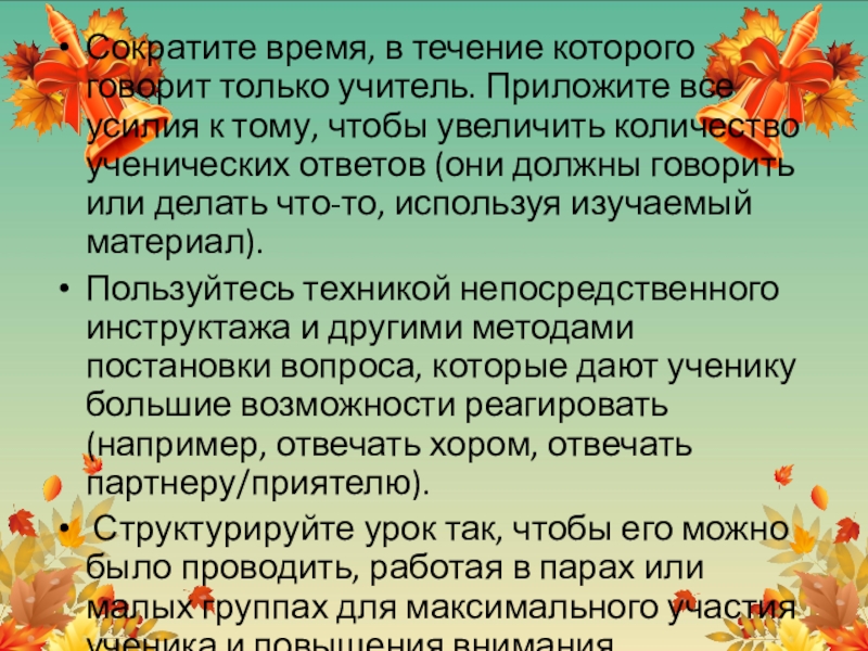 Слайд 4Сократите время, в течение которого говорит только учитель. Приложите все усилия