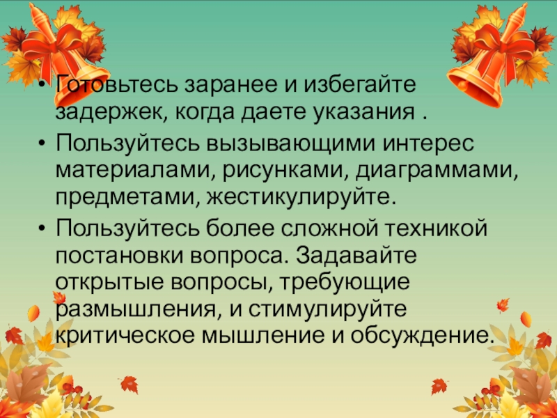 Готовьтесь заранее и избегайте задержек, когда даете указания . Пользуйтесь вызывающими интерес материалами, рисунками, диаграммами, предметами, жестикулируйте.