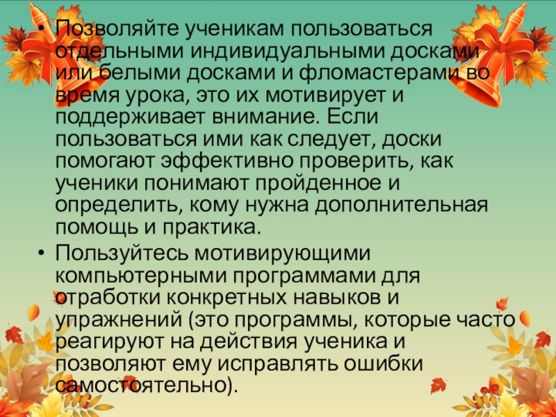 Позволяйте ученикам пользоваться отдельными индивидуальными досками или белыми досками и фломастерами во время урока, это их мотивирует