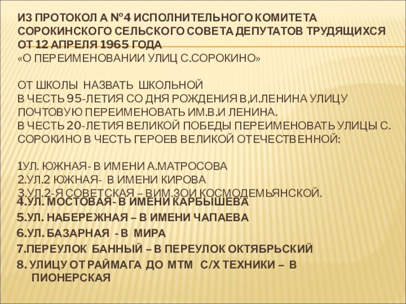 В ЧЕСТЬ 20-ЛЕТИЯ ВЕЛИКОЙ ПОБЕДЫ ПЕРЕИМЕНОВАТЬ УЛИЦЫ С.СОРОКИНО В ЧЕСТЬ ГЕРОЕВ ВЕЛИКОЙ ОТЕЧЕСТВЕННОЙ: