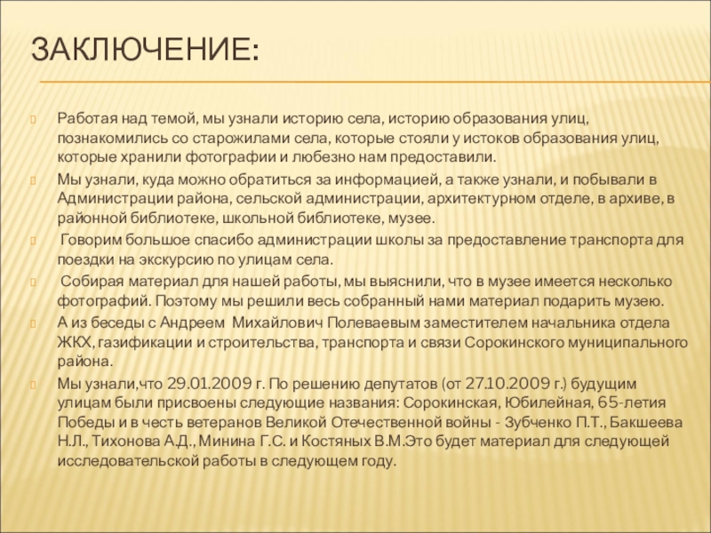 Мы узнали,что 29.01.2009 г. По решению депутатов (от 27.10.2009 г.) будущим улицам были присвоены следующие названия: Сорокинская, Юбилейная, 65-летия Победы и в честь ветеранов Великой Отечественной войны - Зубченко П.Т., Бакшеева Н.Л., Тихонова А.Д., Минина Г.С. и Костяных В.М.Это будет материал для следующей исследовательской работы в следующем году.