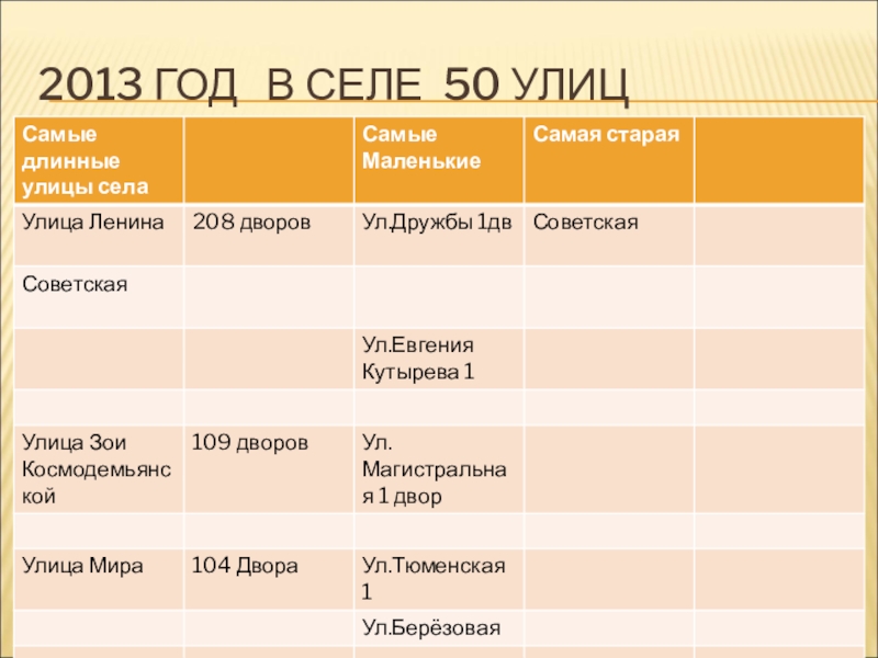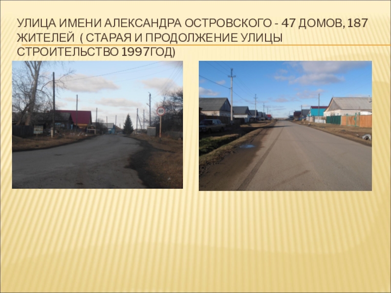 Слайд 29УЛИЦА ИМЕНИ АЛЕКСАНДРА ОСТРОВСКОГО - 47 ДОМОВ, 187 ЖИТЕЛЕЙ ( СТАРАЯ