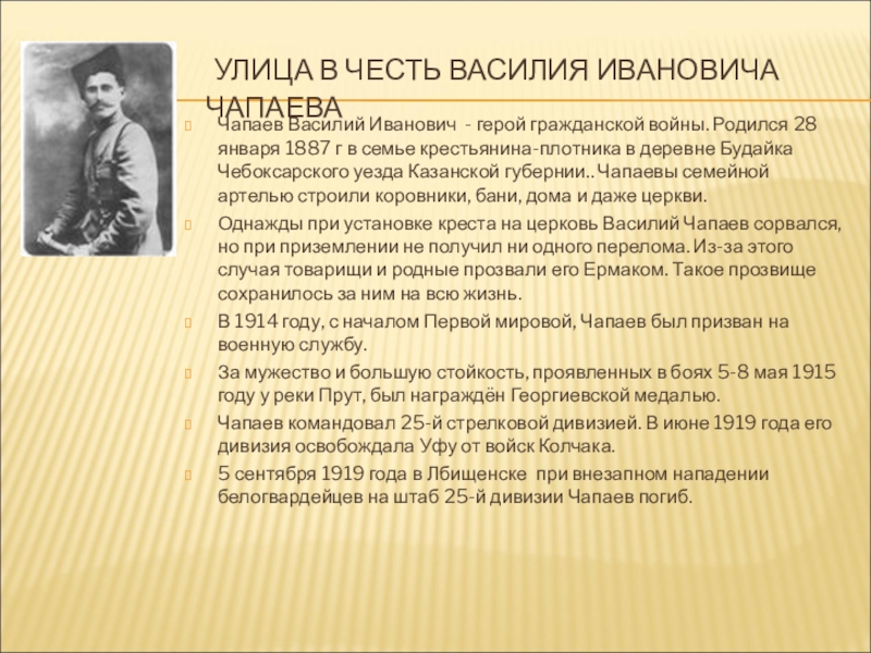 Слайд 31УЛИЦА В ЧЕСТЬ ВАСИЛИЯ ИВАНОВИЧА ЧАПАЕВА -