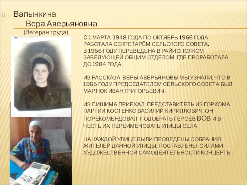 ИЗ КОТОРЫХ МЫ УЗНАЛИ, ЧТО В ТО ВРЕМЯ СЕКРЕТАРЁМ СЕЛЬСКОГО СОВЕТА РАБОТАЛА ВАЛЫНКИНА ВЕРА АВЕРЬЯНОВНА.
