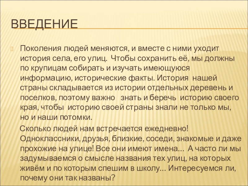 улиц. Чтобы сохранить её, мы должны по крупицам собирать и изучать имеющуюся информацию, исторические факты. История нашей страны складывается из истории отдельных деревень и поселков, поэтому важно знать и беречь историю своего края, чтобы историю своей страны знали не только мы, но и наши потомки.