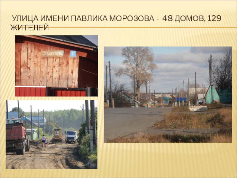 Слайд 27 УЛИЦА ИМЕНИ ПАВЛИКА МОРОЗОВА - 48 ДОМОВ, 129 ЖИТЕЛЕЙ