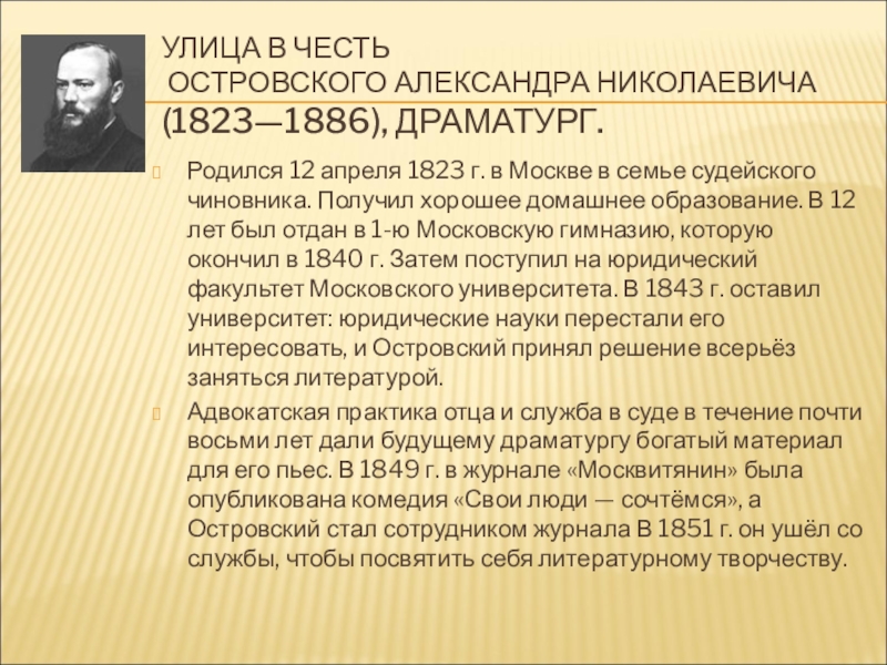 г. в Москве в семье судейского чиновника. Получил хорошее домашнее образование. В 12 лет был отдан в 1-ю Московскую гимназию, которую окончил в 1840 г. Затем поступил на юридический факультет Московского университета. В 1843 г. оставил университет: юридические науки перестали его интересовать, и Островский принял решение всерьёз заняться литературой.