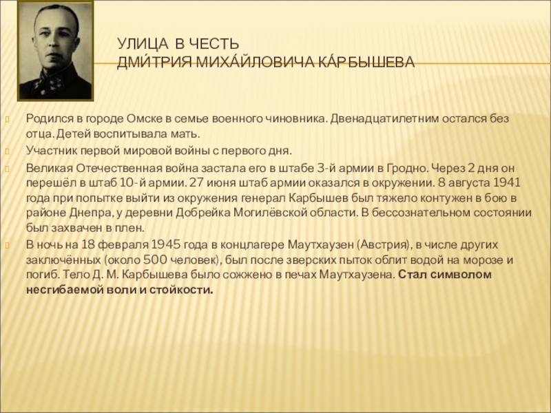 ДМИ́ТРИЯ МИХА́ЙЛОВИЧА КА́РБЫШЕВА
