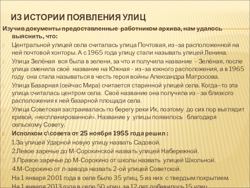 Работая над темой, мы узнали историю села, историю образования улиц, познакомились