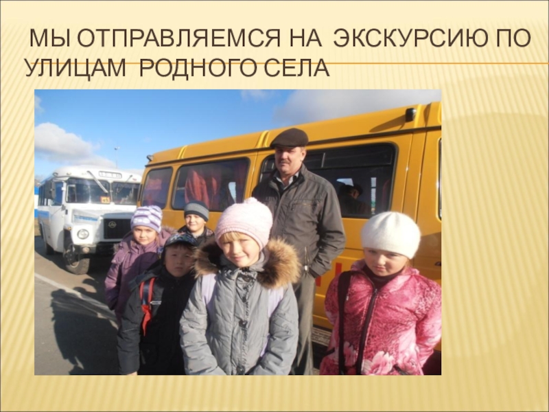 Слайд 12 МЫ ОТПРАВЛЯЕМСЯ НА ЭКСКУРСИЮ ПО УЛИЦАМ РОДНОГО СЕЛА