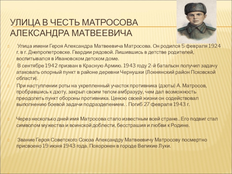 Слайд 16УЛИЦА В ЧЕСТЬ МАТРОСОВА А.М.