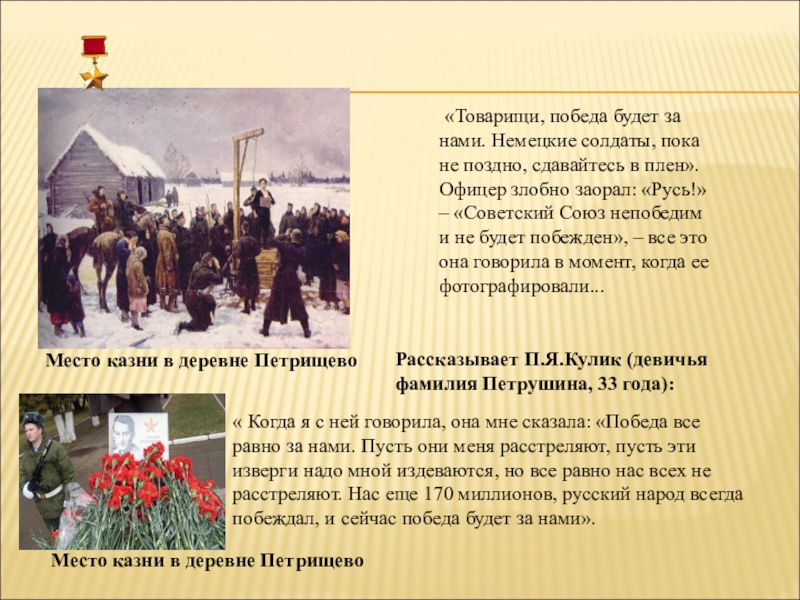 « Когда я с ней говорила, она мне сказала: «Победа все равно за нами. Пусть они меня расстреляют, пусть эти изверги надо мной издеваются, но все равно нас всех не расстреляют. Нас еще 170 миллионов, русский народ всегда побеждал, и сейчас победа будет за нами».