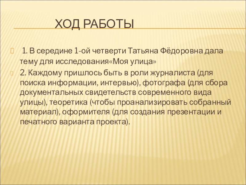 2. Каждому пришлось быть в роли журналиста (для поиска информации, интервью), фотографа (для сбора документальных свидетельств современного вида улицы), теоретика (чтобы проанализировать собранный материал), оформителя (для создания презентации и печатного варианта проекта).
