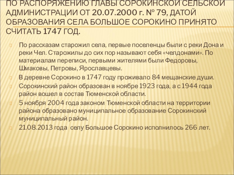 Слайд 6ПО РАСПОРЯЖЕНИЮ ГЛАВЫ СОРОКИНСКОЙ СЕЛЬСКОЙ АДМИНИСТРАЦИИ ОТ 20.07.2000 Г. № 79,