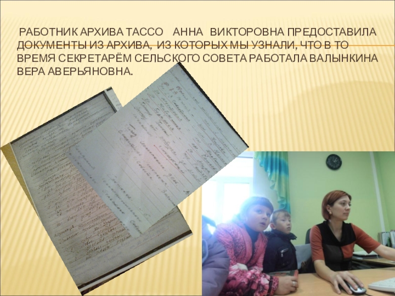 Слайд 7 РАБОТНИК АРХИВА ТАССО АННА ВИКТОРОВНА ПРЕДОСТАВИЛА