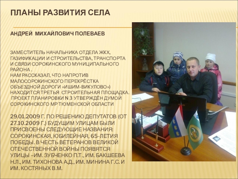 29.01.2009 Г. ПО РЕШЕНИЮ ДЕПУТАТОВ (ОТ 27.10.2009 Г.) БУДУЩИМ УЛИЦАМ БЫЛИ ПРИСВОЕНЫ СЛЕДУЮЩИЕ НАЗВАНИЯ: СОРОКИНСКАЯ, ЮБИЛЕЙНАЯ, 65-ЛЕТИЯ ПОБЕДЫ. В ЧЕСТЬ ВЕТЕРАНОВ ВЕЛИКОЙ ОТЕЧЕСТВЕННОЙ ВОЙНЫ ПОЯВЯТСЯ УЛИЦЫ –ИМ. ЗУБЧЕНКО П.Т., ИМ. БАКШЕЕВА Н.Л., ИМ. ТИХОНОВА А.Д., ИМ. МИНИНА Г.С. И ИМ. КОСТЯНЫХ В.М.