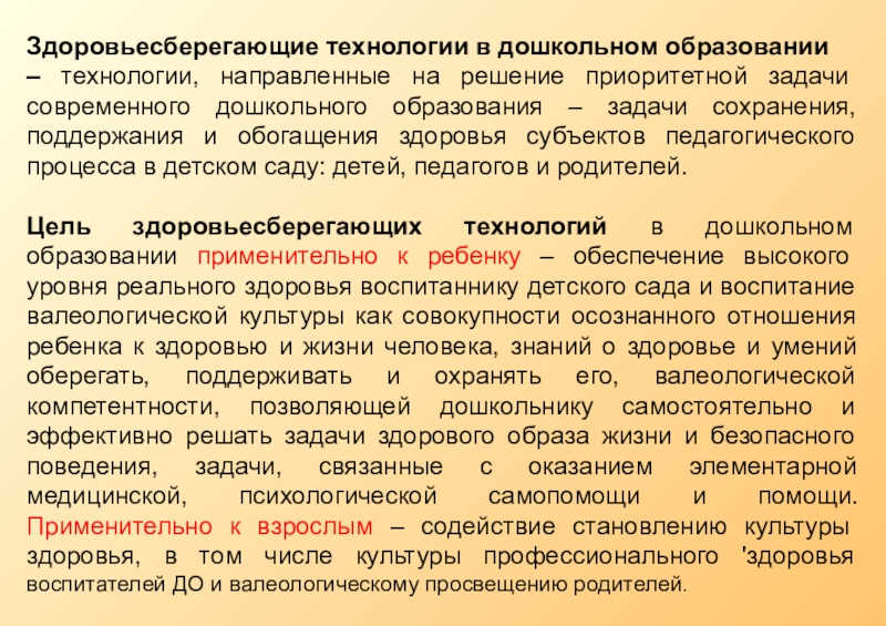 Цель здоровьесберегающих технологий в дошкольном образовании применительно к ребенку – обеспечение высокого уровня реального здоровья воспитаннику детского сада и воспитание валеологической культуры как совокупности осознанного отношения ребенка к здоровью и жизни человека, знаний о здоровье и умений оберегать, поддерживать и охранять его, валеологической компетентности, позволяющей дошкольнику самостоятельно и эффективно решать задачи здорового образа жизни и безопасного поведения, задачи, связанные с оказанием элементарной медицинской, психологической самопомощи и помощи. Применительно к взрослым – содействие становлению культуры здоровья, в том числе культуры профессионального 'здоровья воспитателей ДО и валеологическому просвещению родителей.