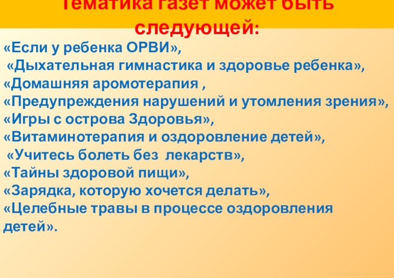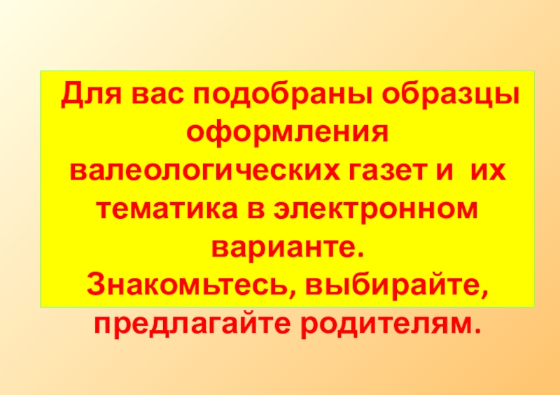 Слайд 20 Для вас подобраны образцы оформления валеологических газет и их тематика