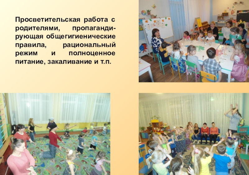 Слайд 9Просветительская работа с родителями, пропаганди-рующая общегигиенические правила, рациональный режим и полноценное