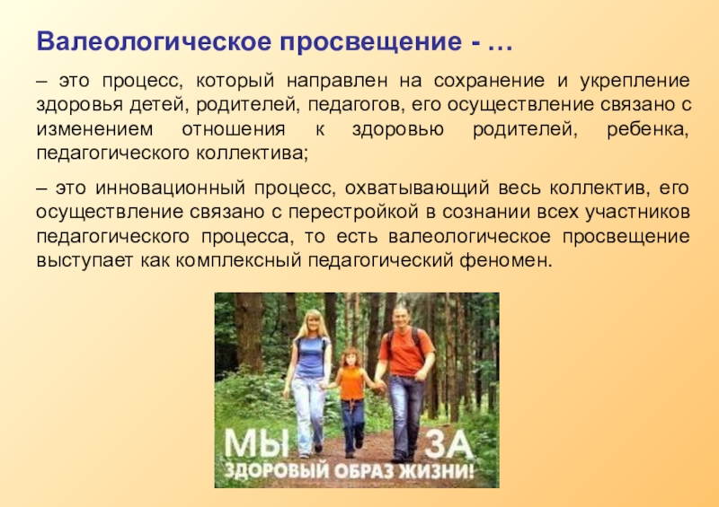 – это инновационный процесс, охватывающий весь коллектив, его осуществление связано с перестройкой в сознании всех участников педагогического процесса, то есть валеологическое просвещение выступает как комплексный педагогический феномен.