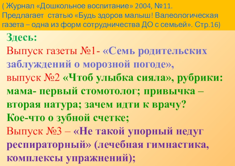 ( Журнал «Дошкольное воспитание» 2004, №11. Предлагает статью «Будь здоров малыш! Валеологическая газета – одна из форм сотрудничества ДО с семьей». Стр.16)